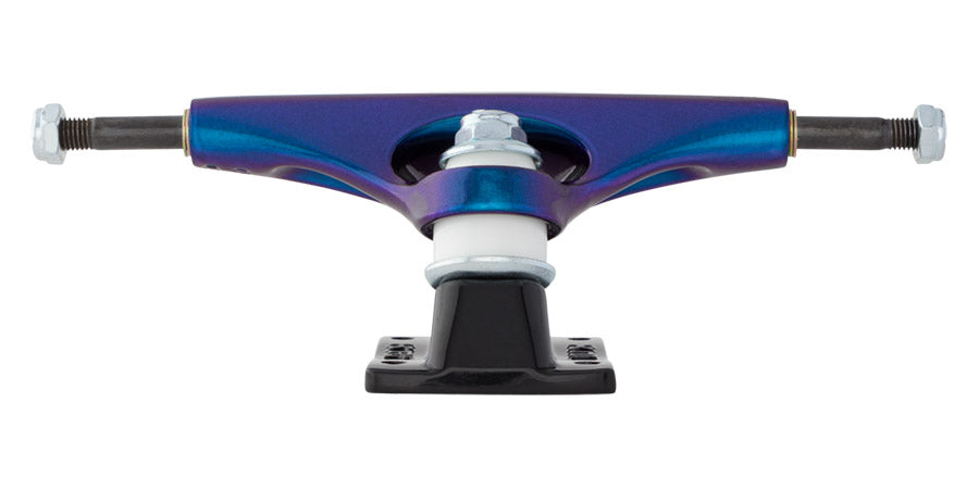 The Krux K5 Chameleon truck changes color in different light similar to an oil-slick paint job seen on custom cars around the world. A hot seller from last year, this new updated pink and blue Chameleon sets itself apart from all the other trucks on the shelf.